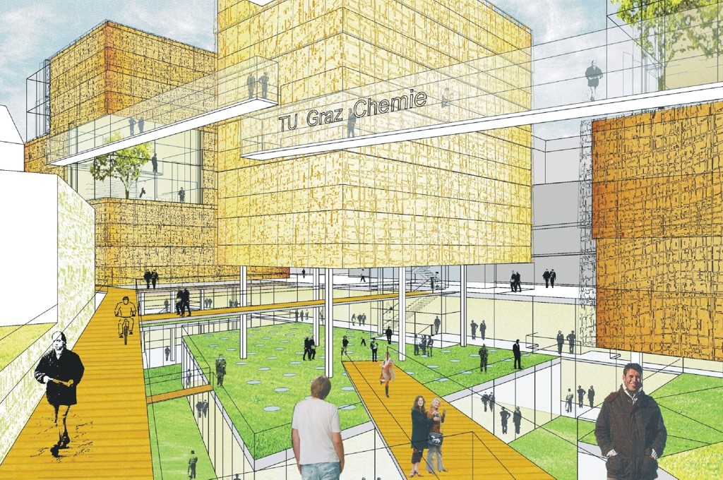 Das Chemie Ersatzgebäude soll die Zusammengehörigkeit zu den bestehenden Gebäuden der chemischen Fakultät betonen und mit diesen eine ablesbare Einheit bilden. Neben städtebaulichen Gründen entspringt die Drei-Turm-Struktur der Idee eines abstrahierten Wassermoleküls mit zwei Volumen an den Seiten und einem Volumen in der Mitte, die wie das Molekül durch (Ver-) Bindungen miteinander verknüpft sind. Die neuen Gebäudekörper bilden mit der bestehenden U-förmigen Anlage eine zusammengehörende Einheit, durch die der vorhandene Innenhof mit der „Neuen Technik“ neu formuliert und aufgewertet wird. Die Volumen des vorhandenen städtebaulichen Ensembles werden proportional aufgenommen und ergänzt, die Traufhöhen fortgeführt. Die Anordnung der neuen Labortürme verstärkt die Eckpunkte der hofartigen Anlage. Das Chemie-Ersatzgebäude wird in zwei Labortürme und einen „dazwischenhängenden“ Büroturm aufgegliedert, die über dem ein- bzw. zweigeschossigen Gartenhof stehen. Um den neu geschaffenen Strassenblock nicht abzuriegeln sondern zur Umgebung zu öffnen wird der Gartenhof in das Gelände abgesenkt. Ein Großteil des Baugrundstückes wird dadurch oberirdisch für den neuen Universitätspark freigehalten und das Universitätsgelände in den Campus und in die Nachbarschaft integriert. Der Zugang zum Universitätsgelände von der Münzgrabenstrasse und Steyrergasse wird durch den neuen Park großzügig aufgewertet. Dieser fließt durch die Außenräume der Universität und verknüpft vormals getrennte Bereiche durch neue Wege- und Raumbeziehungen.