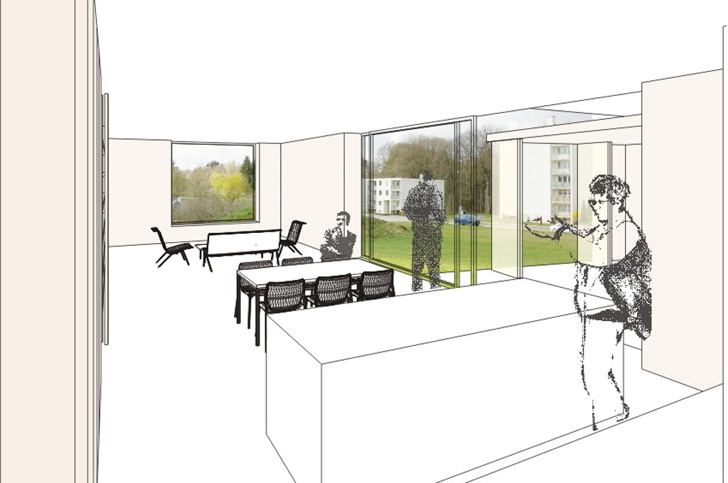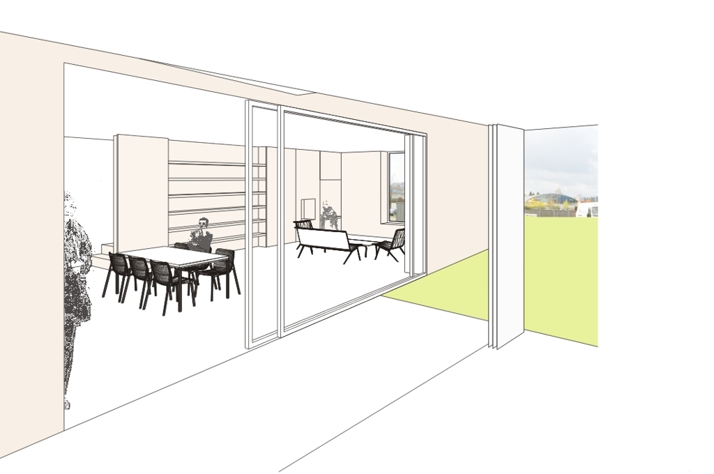 Einfache Baukörper, Lochfassade mit klaren, großzügigen Öffnungen. Geschützte private Innen- und Außenräume innerhalb der heterogenen Neubausiedlung entstehen durch geschickte Anordnung der Öffnungen und der Garage. Bei dem vorgegebenen und begrenzten Gebäudekörper wird die räumliche Großzügigkeit durch einen großen Wohnraum mit dienender Zone und eingestellten Möbeln erreicht.