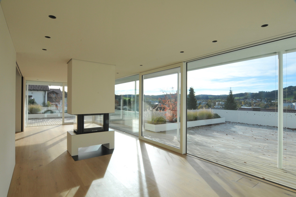 Bodentiefe, große Fensterflächen und Glas-Schiebetüren holen die Landschaft in die beiden Wohnungen und schaffen ein Raumkontinuum zwischen Innen und Außen.