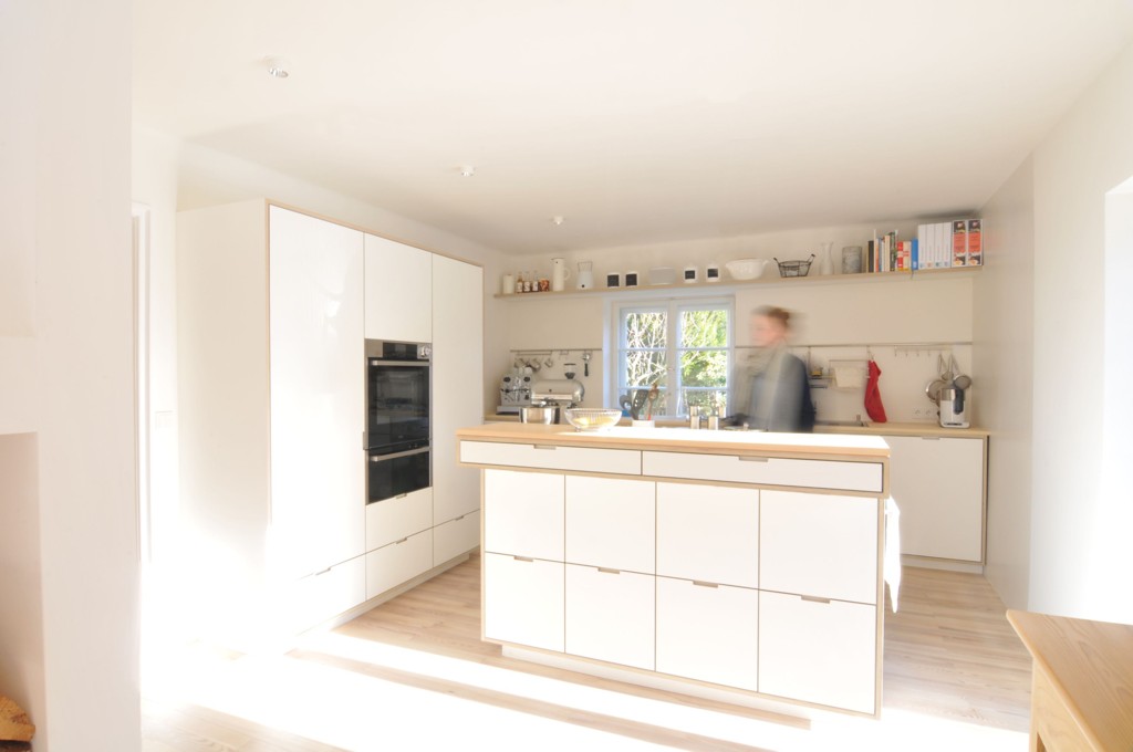 Innen findet man noch die klar aufgeteilten Wohnräume vor, die sich um die alte Holztreppe gruppieren, einfache Stuckfriese als Zeichen bürgerlicher Wohnkultur sowie Holztüren und -zargen. Alles noch handwerklich vom Schreiner gefertigt. Um den Innenraum stärker mit dem Garten zu verweben wurden die Fenster bodentief vergrößert. Die alten Kastenfenster und Fensterläden werden repariert und erhalten. Die alte Treppe und der Holzdielenboden werden abgeschliffen, weiß geseift und an manchen Stellen durch neue Seekieferdielen ergänzt. Bei den Innenwänden wird der ursprüngliche Putz freigelegt und frisch getüncht. Ein Küchenblock ist wie weitere neue Einbaumöbel aus weiß beschichteten Multiplexplatten gefertigt und aktivierendes Element in der Wohnküche. Die größte Wirkung mit minimalem Aufwand erreicht das Freiräumen des Dachraums, wo ein heller und luftiger Raum entsteht, der im Spitz eine neue Galerie beherbergt.