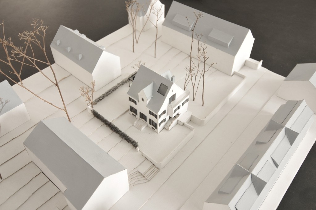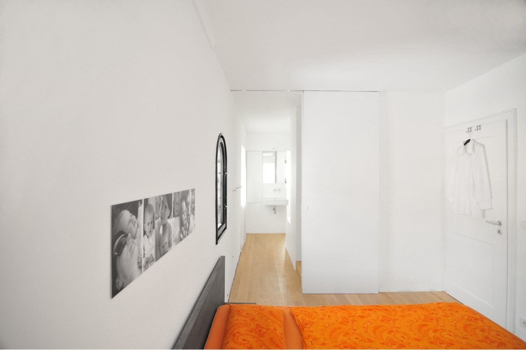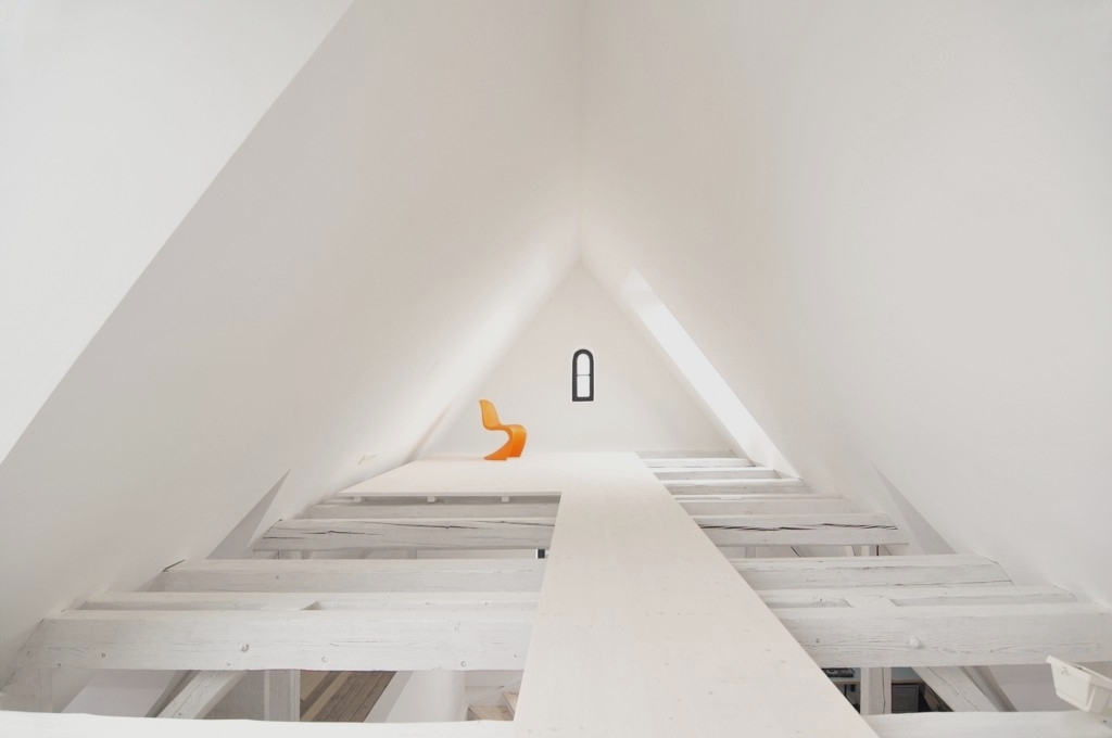 Auch im Inneren sind die Architekten diesen strategischen Weg der behutsamen Inbesitznahme gegangen. Nicht ohne Humor legen sie hierbei im Spitzboden die rohe Struktur der Balken mit unsicherem Abgang frei. So ist das Haus UMS ein liebevoller und beispielgebender Beitrag für die Überführung einer anonymen Haustypologie in unsere Zeit.