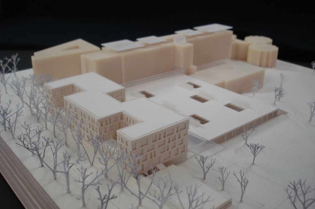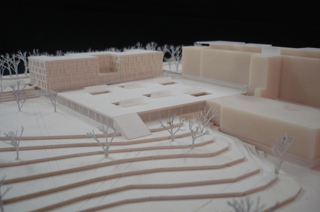 Die Klinik kommt näher an die Stadt heran. Eine Terrassenebene bildet den neuen gemeinsamen