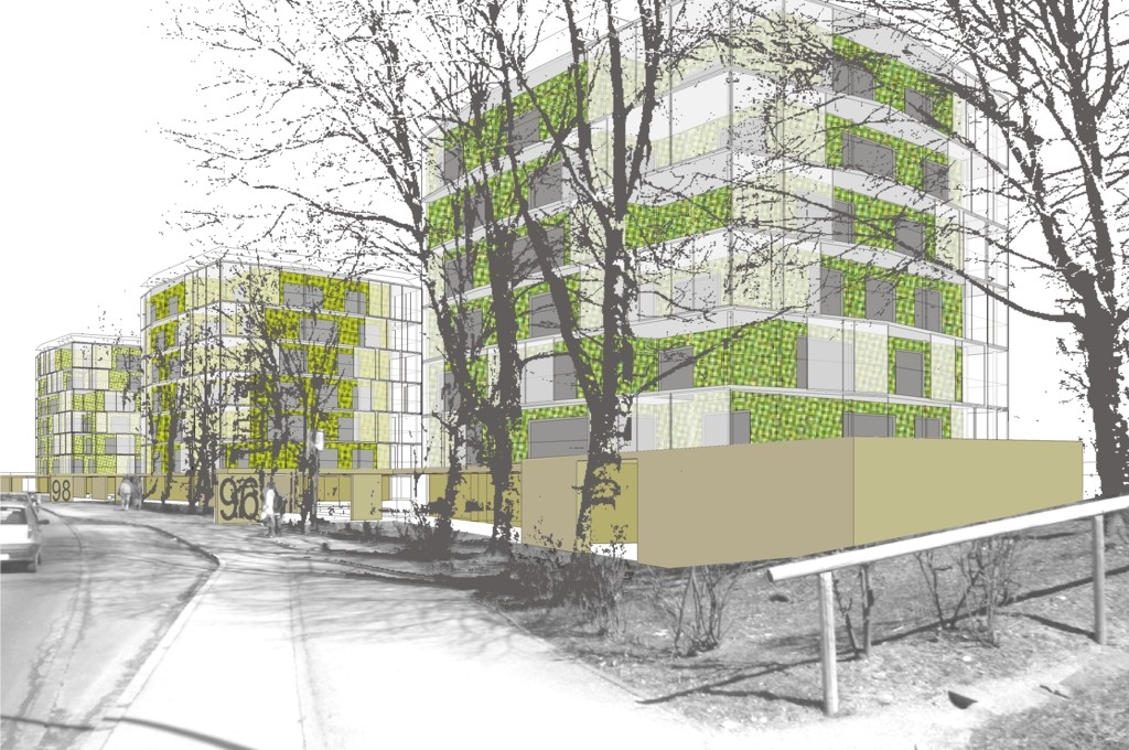 Die statische Grundstruktur der Gebäude wird beibehalten. Wintergärten und Balkone werden als leichte, wirtschaftliche Stahlkonstruktion davor gestellt, um keine Wärmebrücken zur thermischen Hülle zu erzeugen. Die neu gedämmte thermische Hülle ist als hinterlüftete Konstruktion mit Holzfasereinblasdämmung und gefärbten Faserzementplatten geplant. Das Flachdach über dem neuen 6. OG (früheres Dachgeschoss) ist ein Warmdach mit Begrünung im Bereich der Dachgärten.
