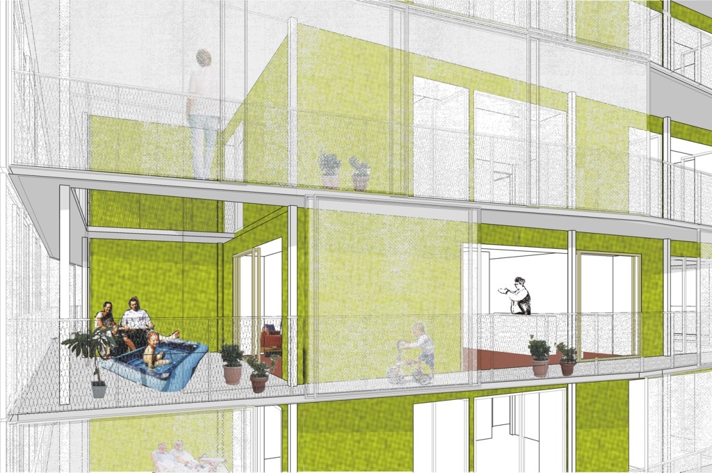 + zusätzliche Räume für die Häusergemeinschaft (Service, Freizeit, Gemeinschaftsraum, Kinderbetreuung, Mietergärten, „Wohnen und Arbeiten“, …