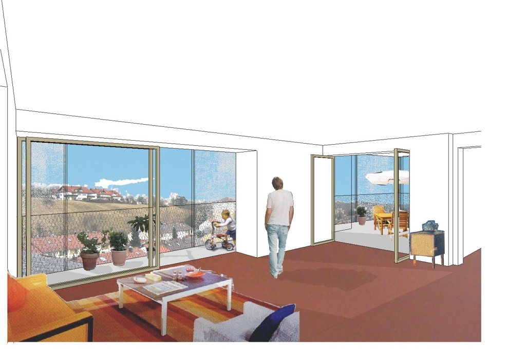 Der Schallschutz gegenüber der stark befahrenen Neugablonzer Straße wird durch die Dreifachverglasung der Öffnungen in Kombination mit der kontrollierten Be- und Entlüftung erreicht.