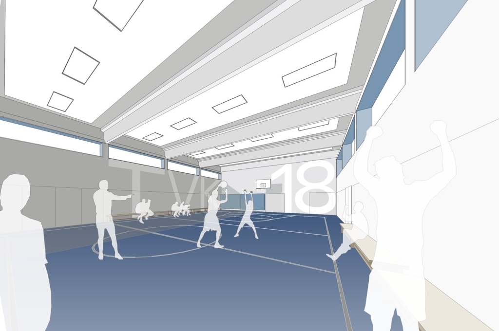 In einem ersten Schritt werden die Neugestaltung des Innenraums der Sporthalle und die energetische Sanierung der Dächer und Fassaden durchgeführt. Die Fassade der Sporthalle erhält eine neue Hülle aus transluzenten Polycarbonatstegplatten, die zugleich als Dämmung dient und passivsolare Energiegewinne ermöglicht. Die Hallenwände hinter der Rodecafassade wirken als Speichermassen und leiten im Winter die energetischen Gewinne über die Hallenwände nach innen. Um in den wärmeren Jahreszeiten keine Überhitzung der Polycarbonatfassade zu erhalten, wird die warme Luft über Öffnungen in der Fassade automatisch abgeleitet.Die Polycarbonatfassade leistet eine höhere Energieeinsparung als eine konventionelle Wärmedämmung.
