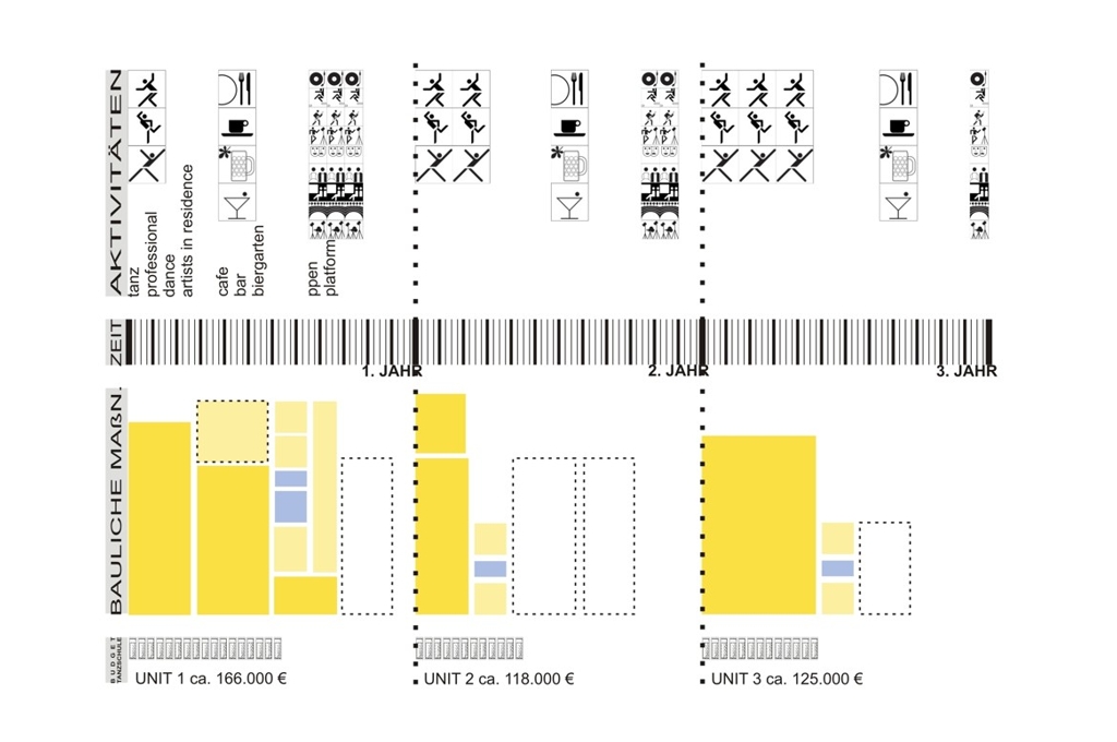 Konversion einer ehemaligen Papierfabrik in eine Tanzakademie. Konzeption eines zeitlich und baulich gestuften Entwicklungsprozesses.