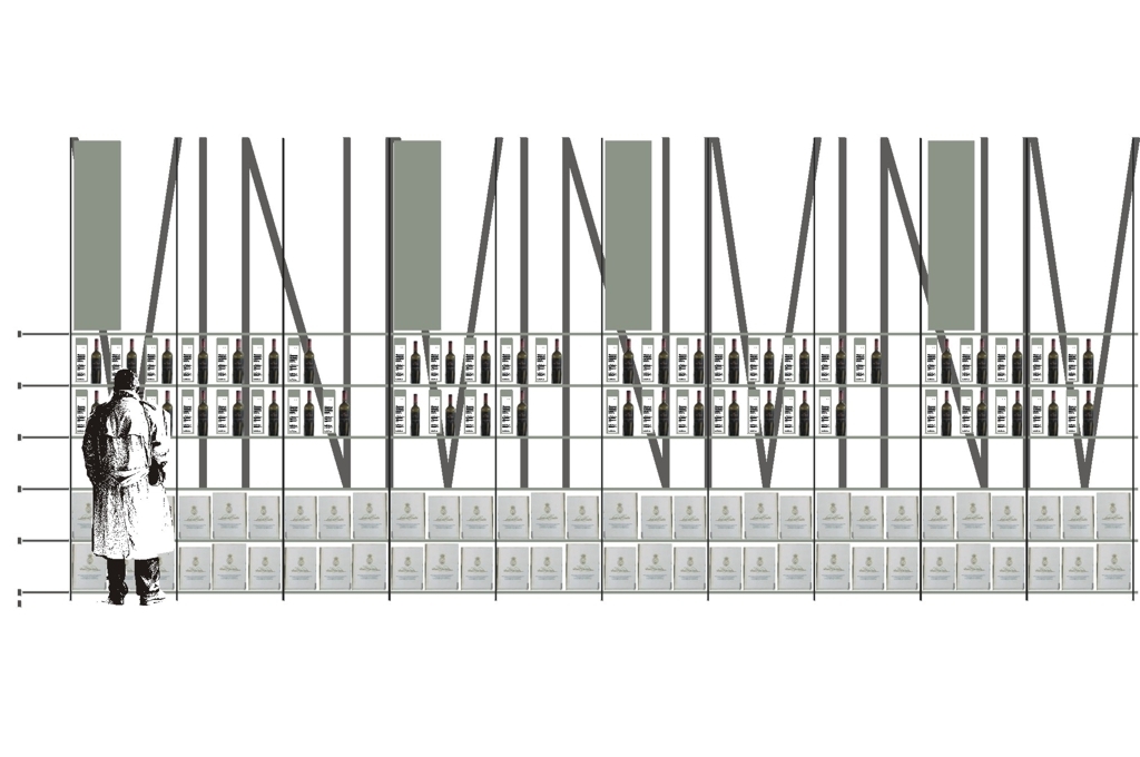 Konstruktion der Weinregale überlagert mit großformatigem Text erinnert an das abstrahierte Bild von Weinreben.