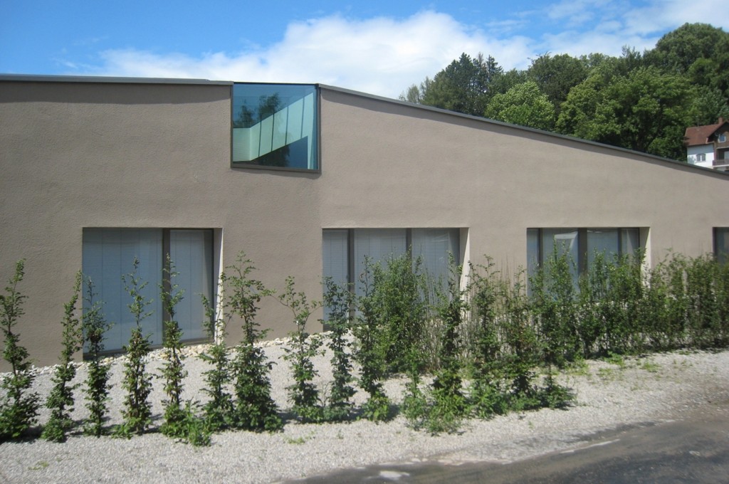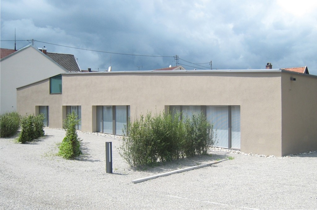 Er empfängt den Besucher und leitet ihn ins Gebäude. Im Zusammenspiel mit der Nachbarbebauung entsteht ein spannungsvoller Gartenraum. Eingang, Rezeption und Warten finden in einem hohen Raum statt, der sich durch ein Glasoberlicht zum Himmel öffnet. Zu den Behandlungszimmern wird der Raum niedriger und verjüngt sich. Dadurch wird der langgestreckte Baukörper räumlich betont und erlebbar. Die Freiflächen sind durchgehend gekiest und bilden eine klare Plattform für den plastischen Baukörper. Das Niedrigenergiehaus wurde als verputzter Massivbau mit extensiv begrüntem Dach ausgeführt.